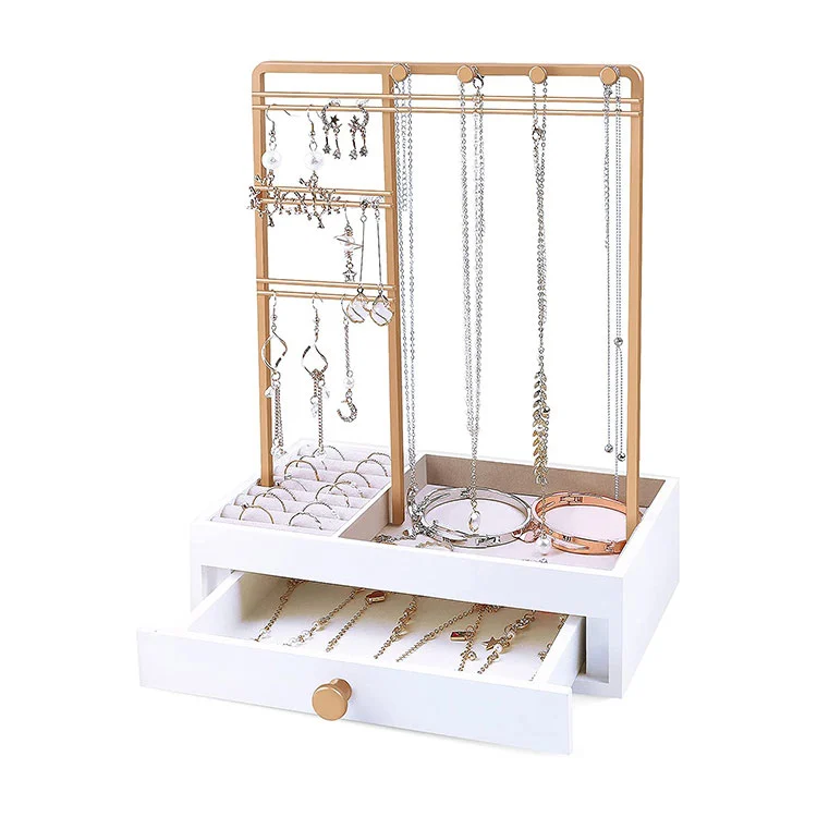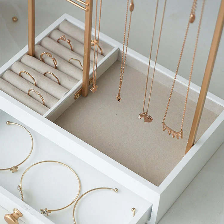 ఎగువ లేయర్ ఓపెన్ డిస్‌ప్లే ప్రాంతం: గోల్డెన్ మెటల్ ఫ్రేమ్, నెక్లెస్‌లు, చెవిపోగులు మరియు బ్రాస్‌లెట్‌లను వేలాడదీయడానికి అనుకూలం. ఇది చూడటం సులభం మరియు అవసరమైనప్పుడు యాక్సెస్ చేయవచ్చు.