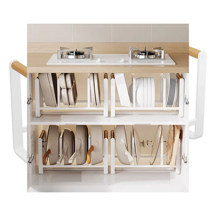 బహుళ-కంపార్ట్మెంట్ డిజైన్ కుండలు మరియు వాటి మూతలు (లేదా ఇతర వంటగది పాత్రలు) ఏకకాలంలో నిల్వ చేయడానికి అనుమతిస్తుంది, "పేర్చబడిన" మరియు గజిబిజి ఏర్పాట్ల అవసరాన్ని తొలగిస్తుంది.